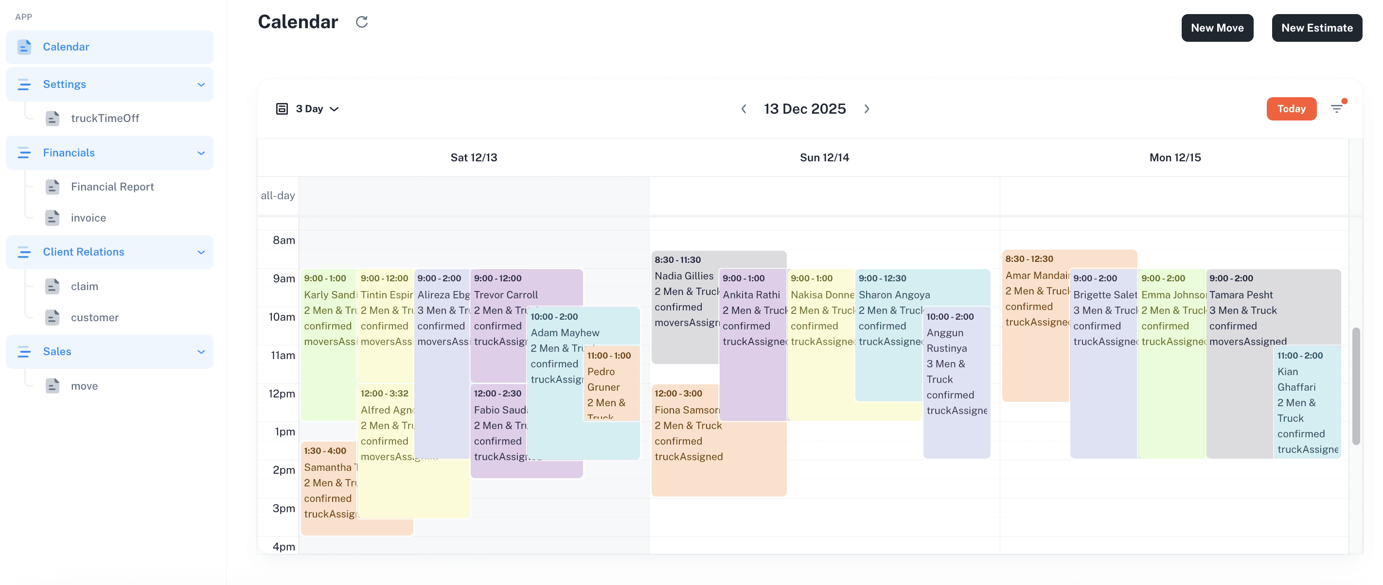 Create estimates, book moves, and assign trucks and movers. See all jobs clearly by status — booked, in progress, or completed.